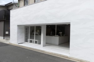 Nous passons devant un curieux café dont la devanture est toute blanche, sans absolument aucune enseigne ni inscription. Ce qui est assez surprenant, encore plus au Japon. Le rez-de-chaussée lui aussi minimaliste présente une machine à moudre le café sur un grand comptoir.
